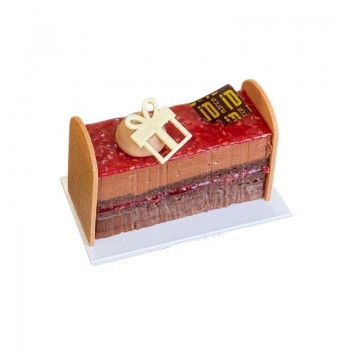 Notre bûche Rubis sans gluten est composée d'une mousse chocolat-framboise grand cru Madagascar, d'un confit framboise, d'un crémeux chocolat noir, d'un biscuit et d'un crumble chocolat.