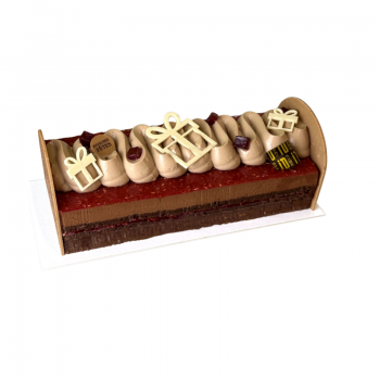 Ingrédients : crème (crème, stabilisant : carraghénane ), lait entier, sucre semoule, chocolat au lait (sucre, beurre de cacao, poudre de lait entier, pâte de cacao, poudre de lait écrémé, émulsifiant : lécithine de soja, arôme naturel de vanille), jaune d'oeuf, chocolat de couverture noir (pâte de cacao, sucre, émulsifiant: lécithine de soja sans OGM), chocolat blanc (sucre, beurre de cacao, poudre de lait entier, lécithine de soja, arôme naturel de vanille), beurre de cacao, pâte de cacao, sucre, poudre de lait entier, lécithine de soja et tournesol, arôme naturel de vanille, sirop de glucose, beurre, blanc d'oeuf, poudre de cacao, noix, sucre inverti, fèves de tonka, eau, gélatine, fleur sel de Guérande.