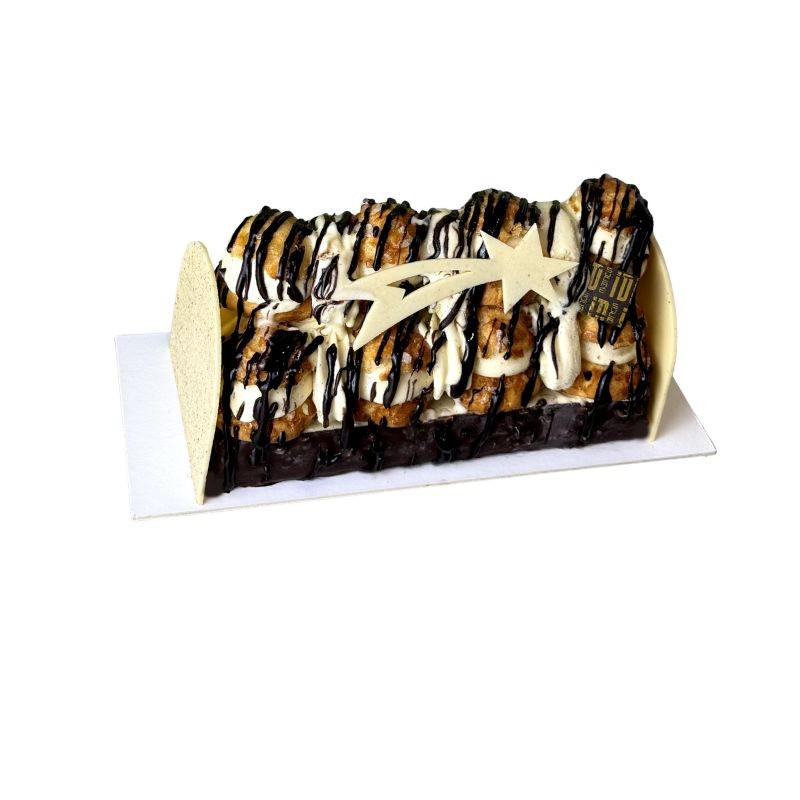 Notre bûche glacée Profiteroles est composée de chouquettes garnies de crème glacée vanille, d'un biscuit chocolat et d'un coulis chocolat.