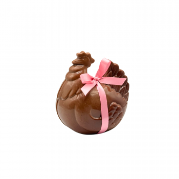 Célébrez Pâques avec notre poule en chocolat, délicatement garnie de fritures chocolatées, disponible en chocolat noir, au lait ou blanc !
