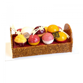 Notre bûche glacée Marmite de Fruits sans gluten est composée de sorbets citron, passion, fraise, framboise et mangue accompagnés de nougatine.