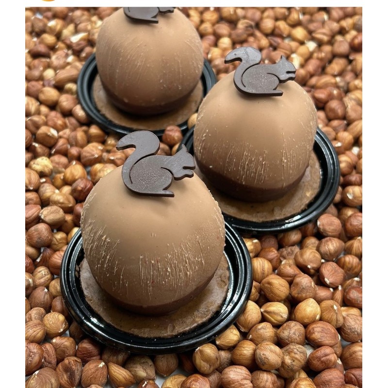 Le trompe-l'oeil La noisette se compose d’une ganache montée à la noisette, d’un cœur caramel et praliné coulant, d’une dacquoise noisette et d’un croustillant praliné qui apporte texture et gourmandise.