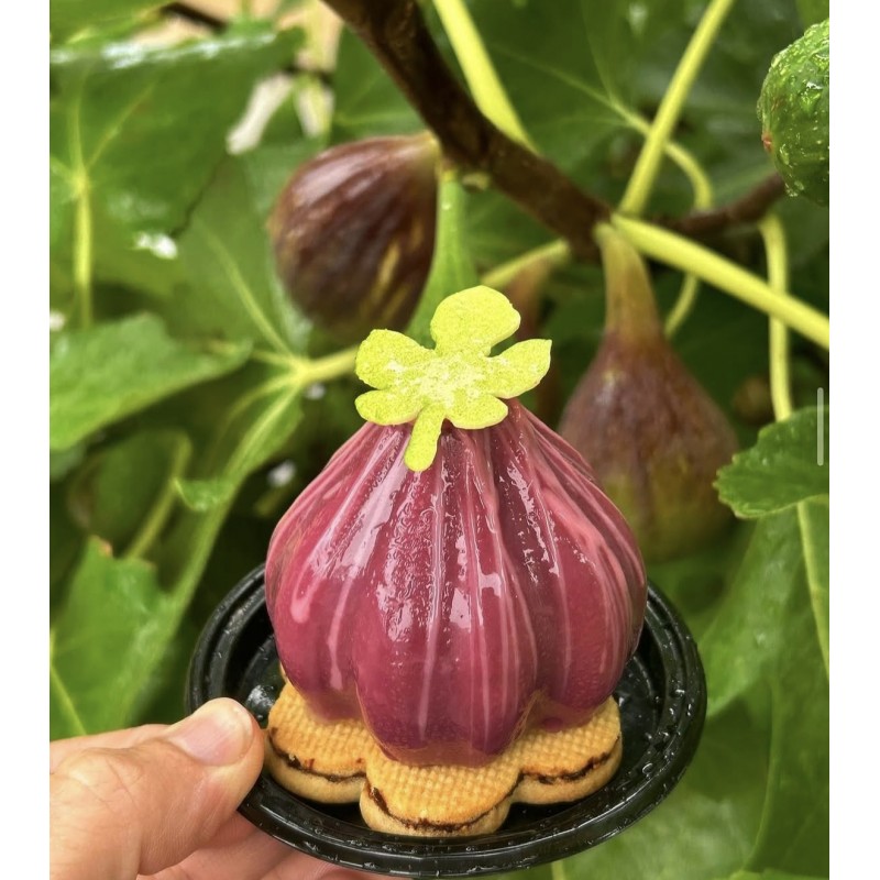 Savourez notre trompe l'oeil à la figue : une crème légère aux figues fraîches, un confit de figues fraîches et aux framboises ainsi qu'un biscuit sablé façon figolu.