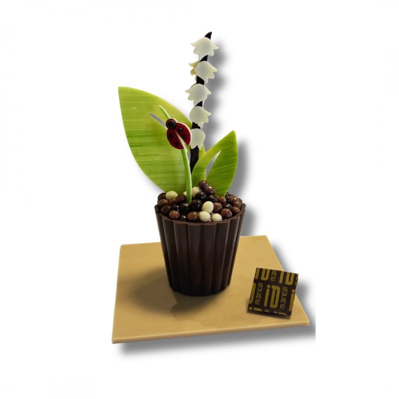 Célébrez le 1er mai avec ce brin de muguet en chocolat, délicatement posé sur son pot et garni d'un caramel au beurre salé ainsi que d'un praliné fondant, pour un plaisir gourmand et porte-bonheur.
