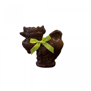 Laissez-vous séduire par notre souris de Pâques en chocolat, délicatement garnie de fritures chocolatées et disponible en chocolat noir ou au lait.