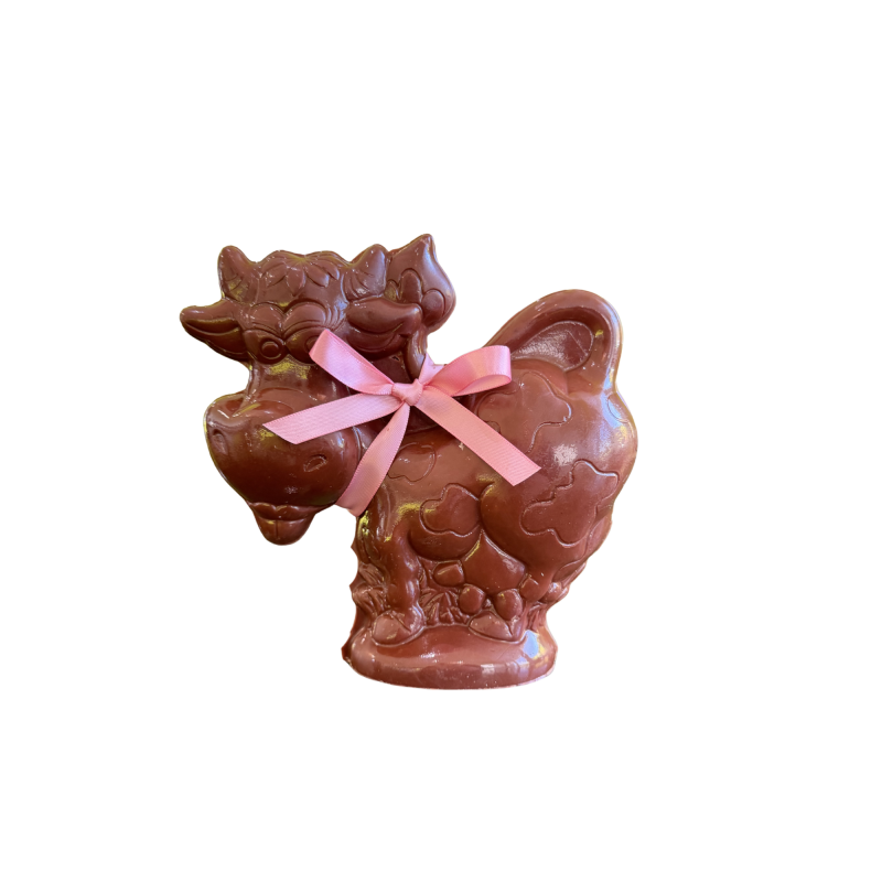 Laissez-vous charmer par notre vache de Pâques en chocolat, généreusement garnie de savoureuses fritures chocolatées et disponible en chocolat noir ou au lait !
