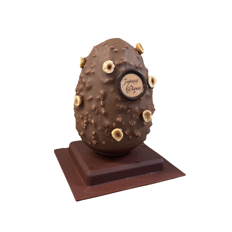 Plongez dans la gourmandise avec notre œuf rocher praliné, un écrin de chocolat croustillant renfermant un praliné noisette fondant, et de généreux morceaux de noisettes 100% mayennaises – une douceur irrésistible pour un plaisir intense à Pâques !