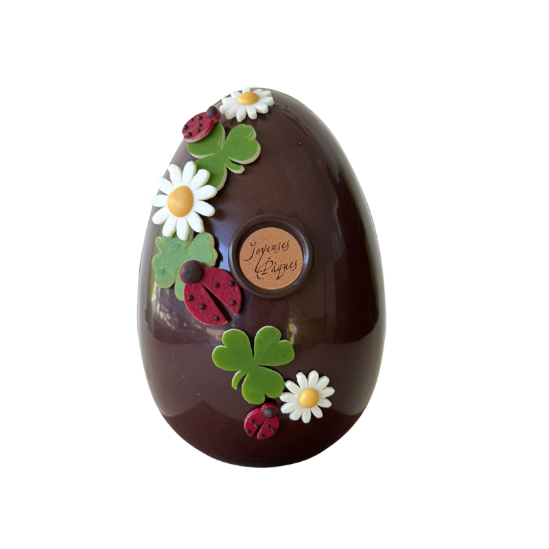 Pour Pâques, succombez à notre œuf en chocolat noir, décoré de fines coccinelles en chocolat.