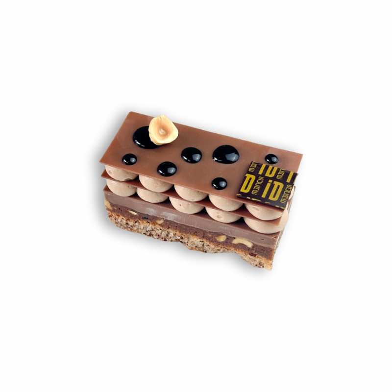 crème(crème, stabilisant : carraghénane ) , chocolat au lait (beurre de cacao, lait entier en poudre, sucre, fèves de cacao, sucre roux, extrait naturel de vanille, émulsifiant : lécithine de soja, extrait de malt ( d'orge), chocolat au lait (sucre, beurre de cacao, poudre de lait entier, pâte de cacao, poudre de lait écrémé, émulsifiant : lécithine de soja, arôme naturel de vanille), sucre glace, blanc d'oeuf, poudre de noisettes, sucre semoule, biscuit au beurre (farine de blé, sucre, beurre, lait, sel, extrait de malt (orge), poudre à lever), noisette, mascarpone (lait), eau, beurre, sirop de glucose, poudre de cacao, sucre inverti, gélatine, vanille en gousse