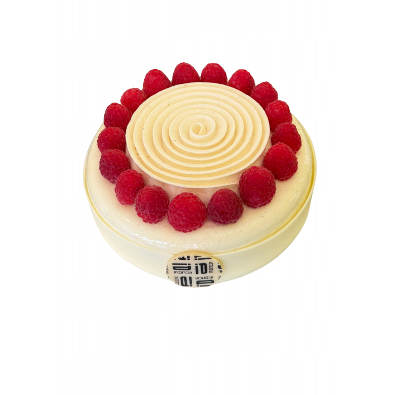Composition : crème légère vanille-chocolat blanc, compotée de framboises au Yuzu, croustillant amande, dacquoise.