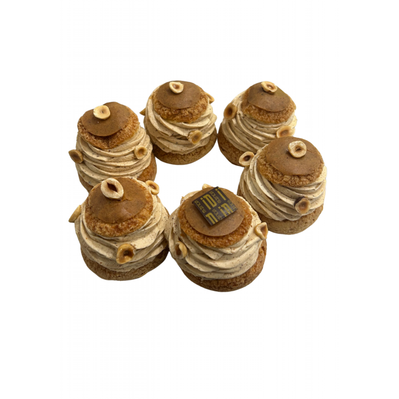 Composition : pâte à choux - craquelin , Crème légère praliné, coeur coulant praliné.